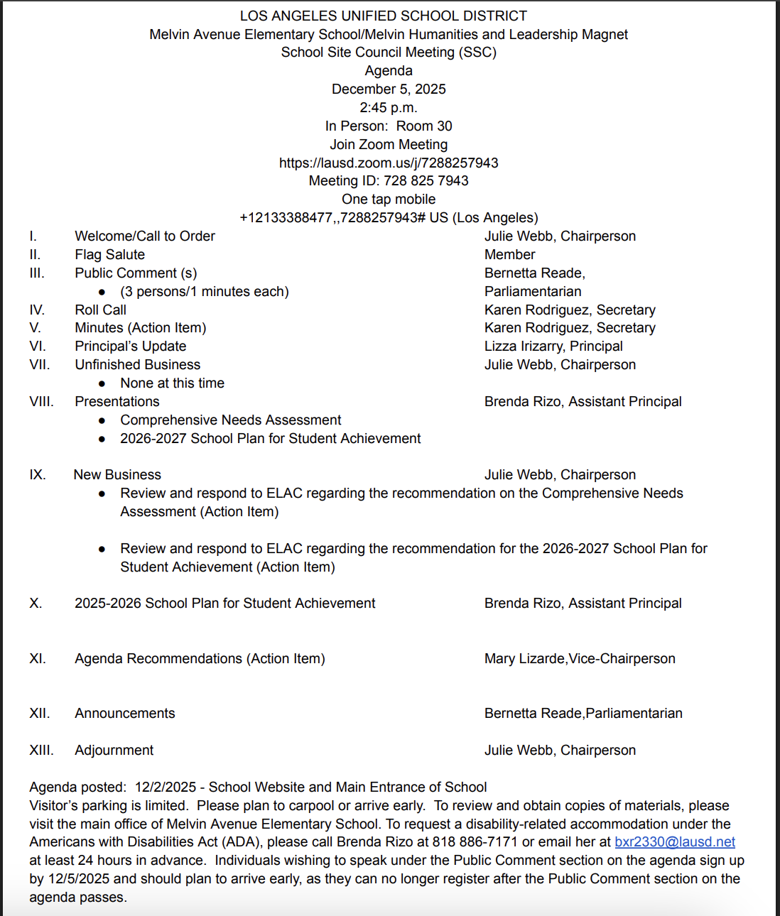 School Site Council Meeting/Reunion del Consejo del Plantel Escolar (SSC) - 12/5/25, 2:45 pm